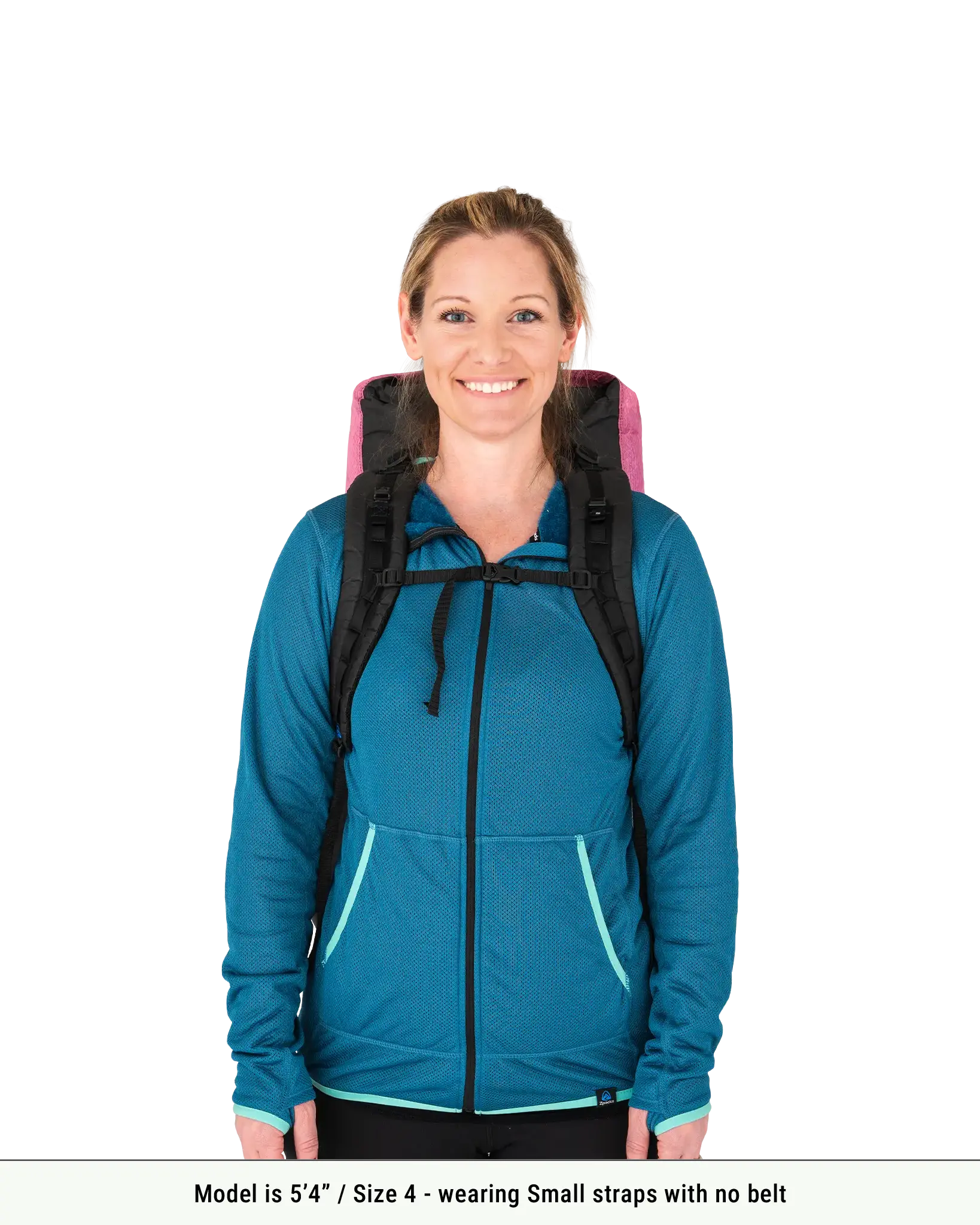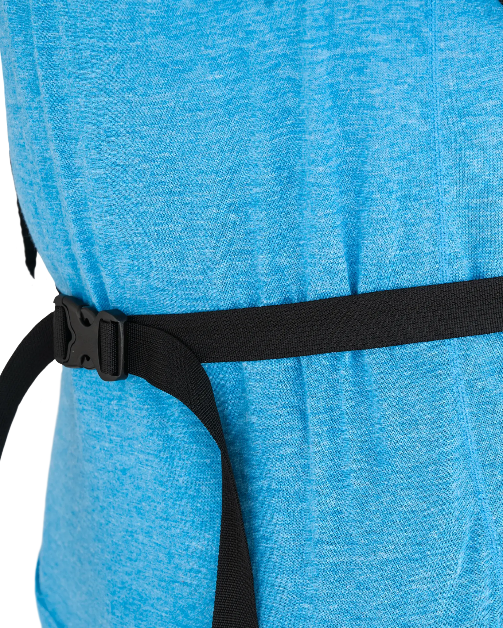 Our 30L backpacks have a single belt attachment position at 18". Our larger backpacks have three belt positions, ranging from 18" to 22" (46 to 56 cm) to dial in the torso height. On a frameless backpack, it is nice to have the shoulder straps roughly level with the tops of your shoulders (rather than wrapping up around them) so that more weight is forced on to the webbing belt. The pack body does not extend much above your shoulders and load lifter straps are not needed.