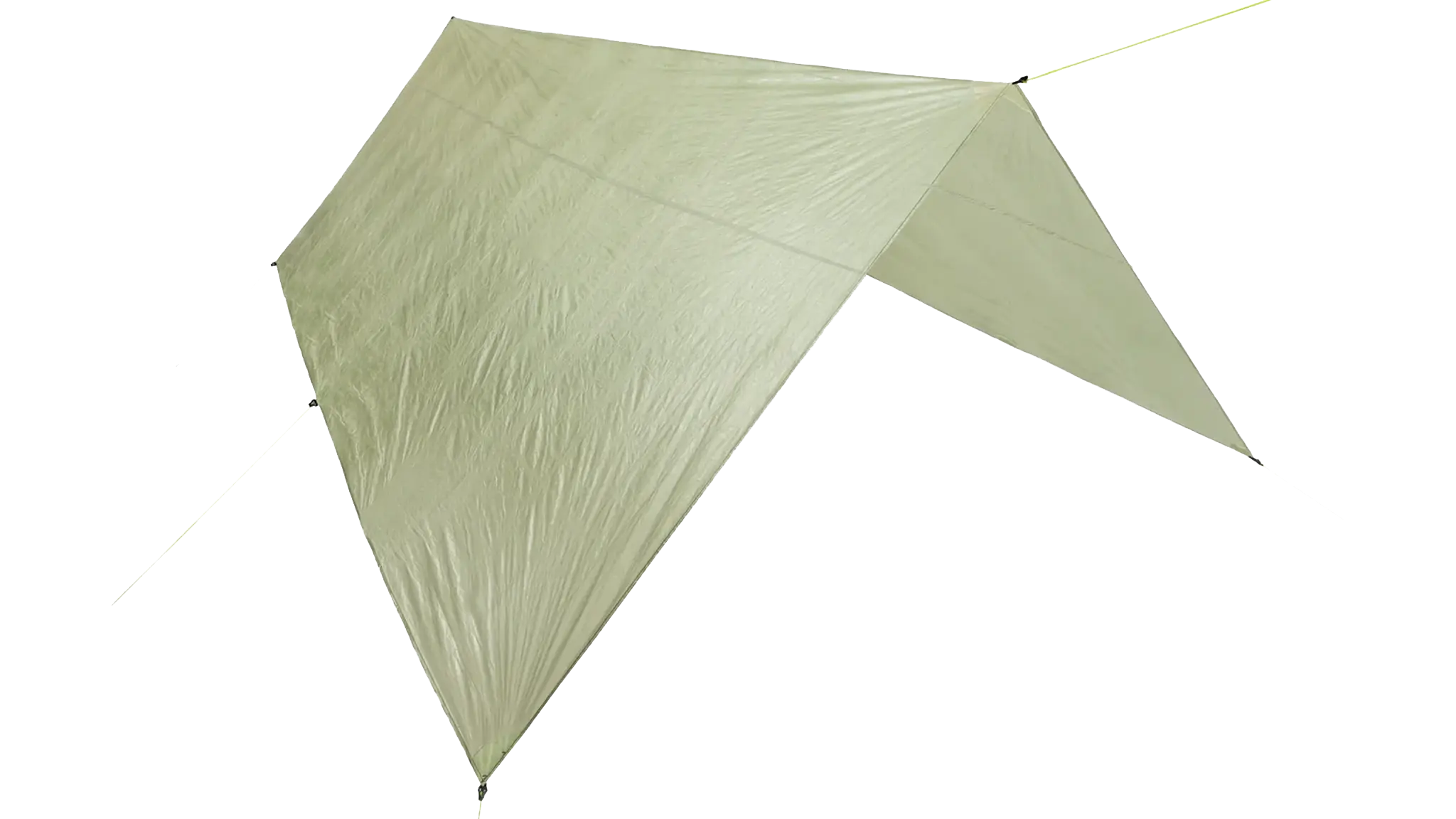 This tarp pitches best in a diamond configuration with two long lines clipped around trees, and two short lines staked to the ground.