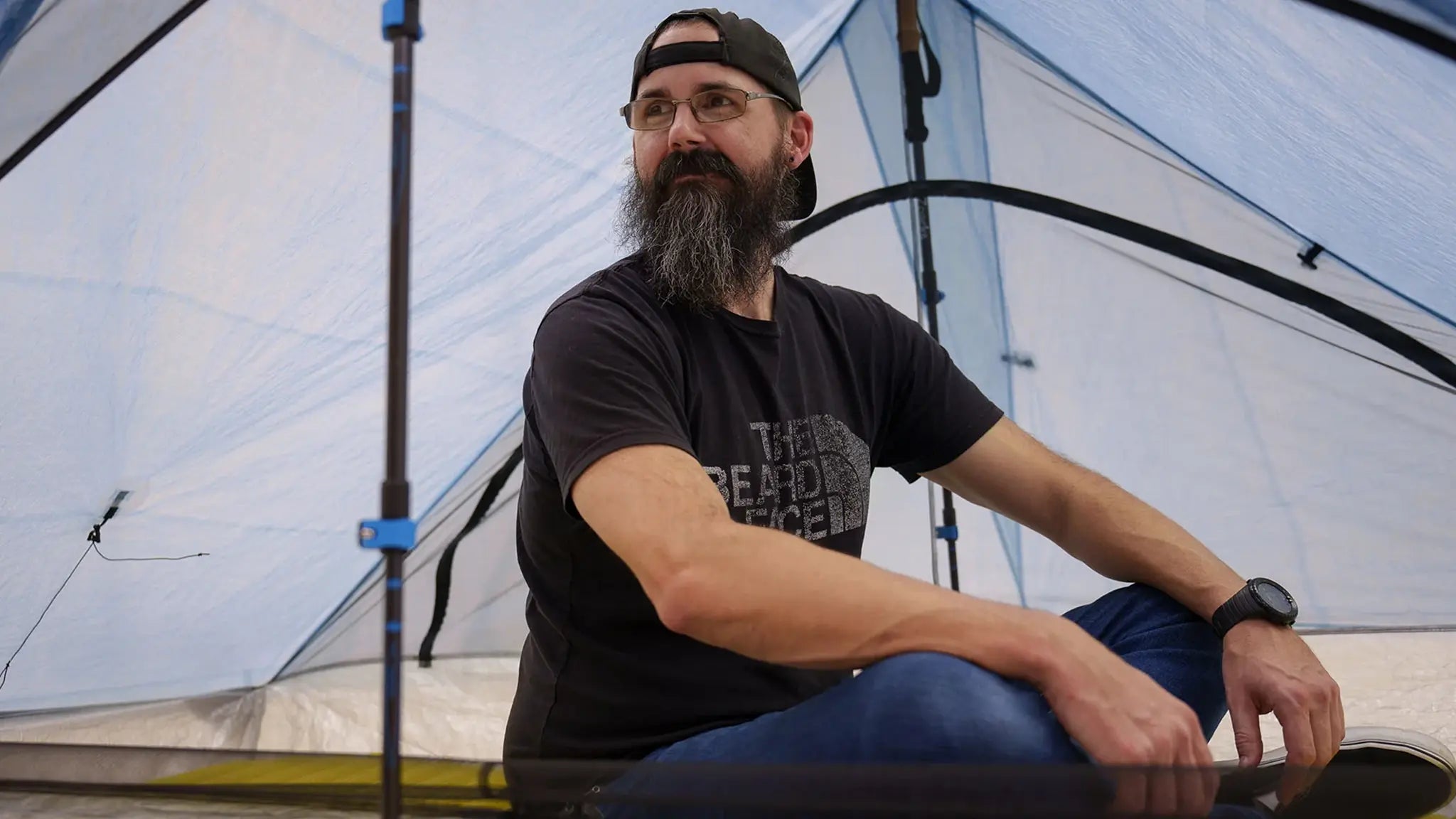 - Two people can sit upright side by side facing out either door while removing shoes or while reaching out to cook or access gear just outside the tent.