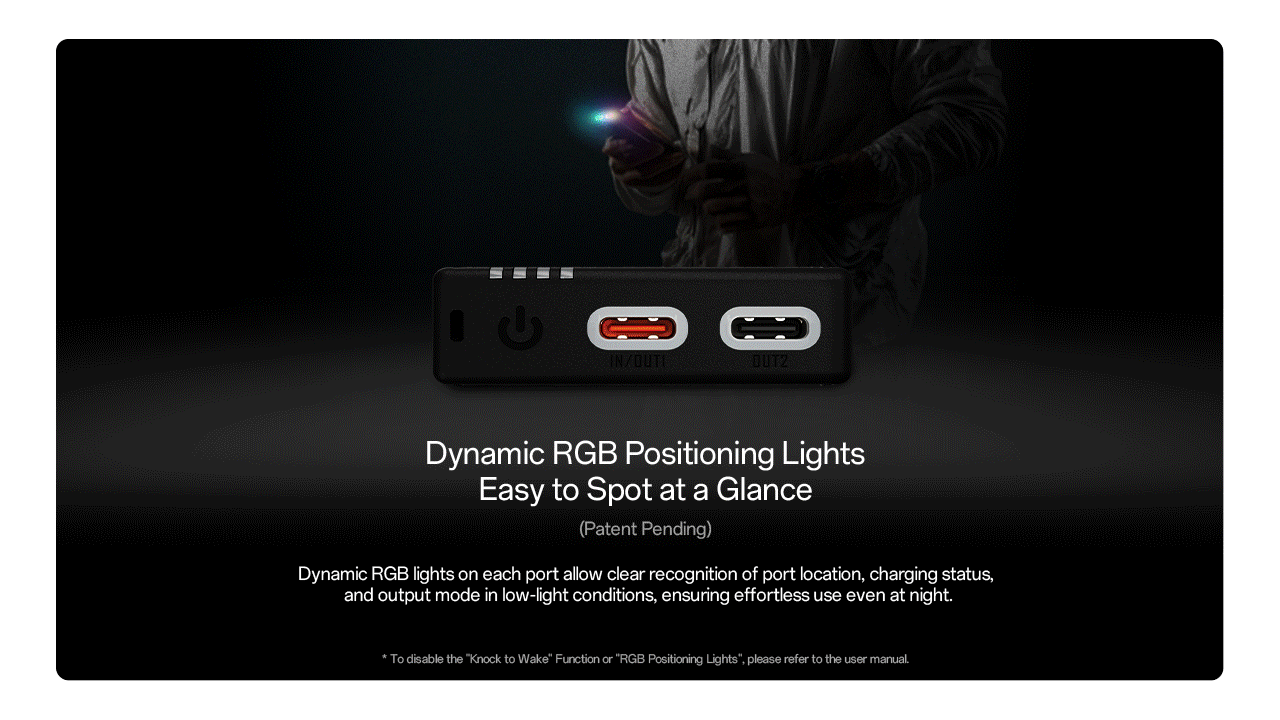 - Double-knock the upper part of the power bank to wake up the power indicators and charging port indicators.